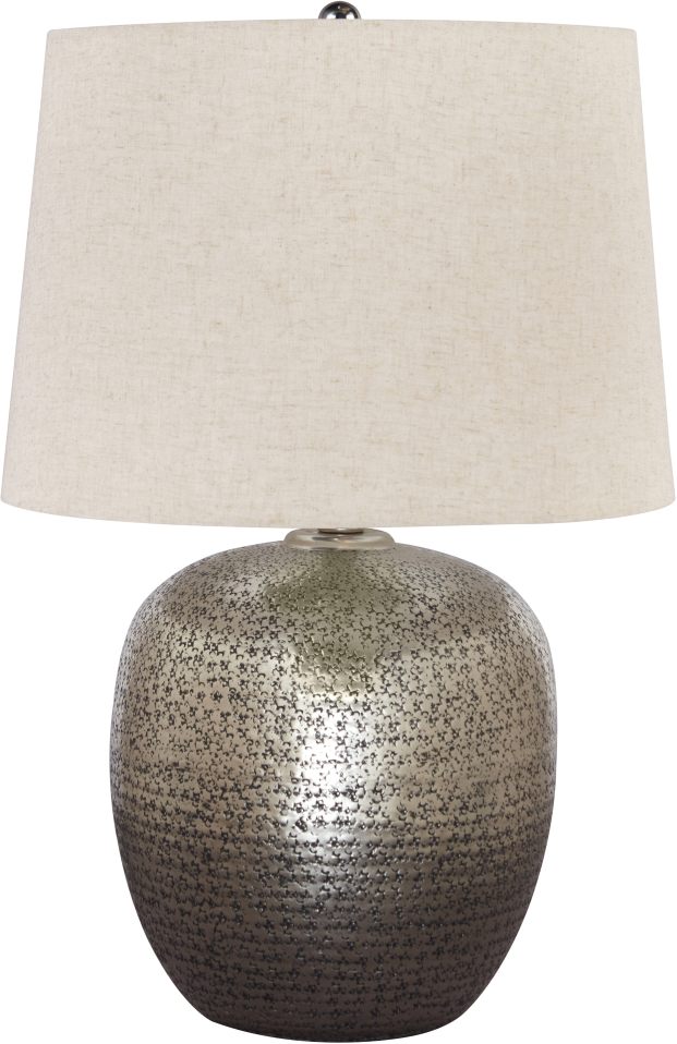 The Magalie lamp features a hammered aluminum base and a fabric lampshade that accentuates lighting for a relaxed glow.
