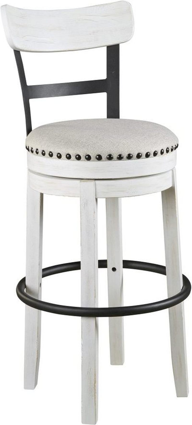 Dine in all-around comfort with the wrapping footrest and polyester upholstered cushioning of the Valebeck tall swivel barstool. With 360° of motion, its nailhead trimming and splayed metal back are ready to display.